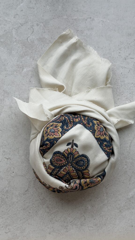This a cashmere shawl print and in the Emirati style. To determine your child’s correct size, please measure their head circumference in inches. If measuring in centimeters, multiply that measurement by 2.54 to get the correct size in inches.
