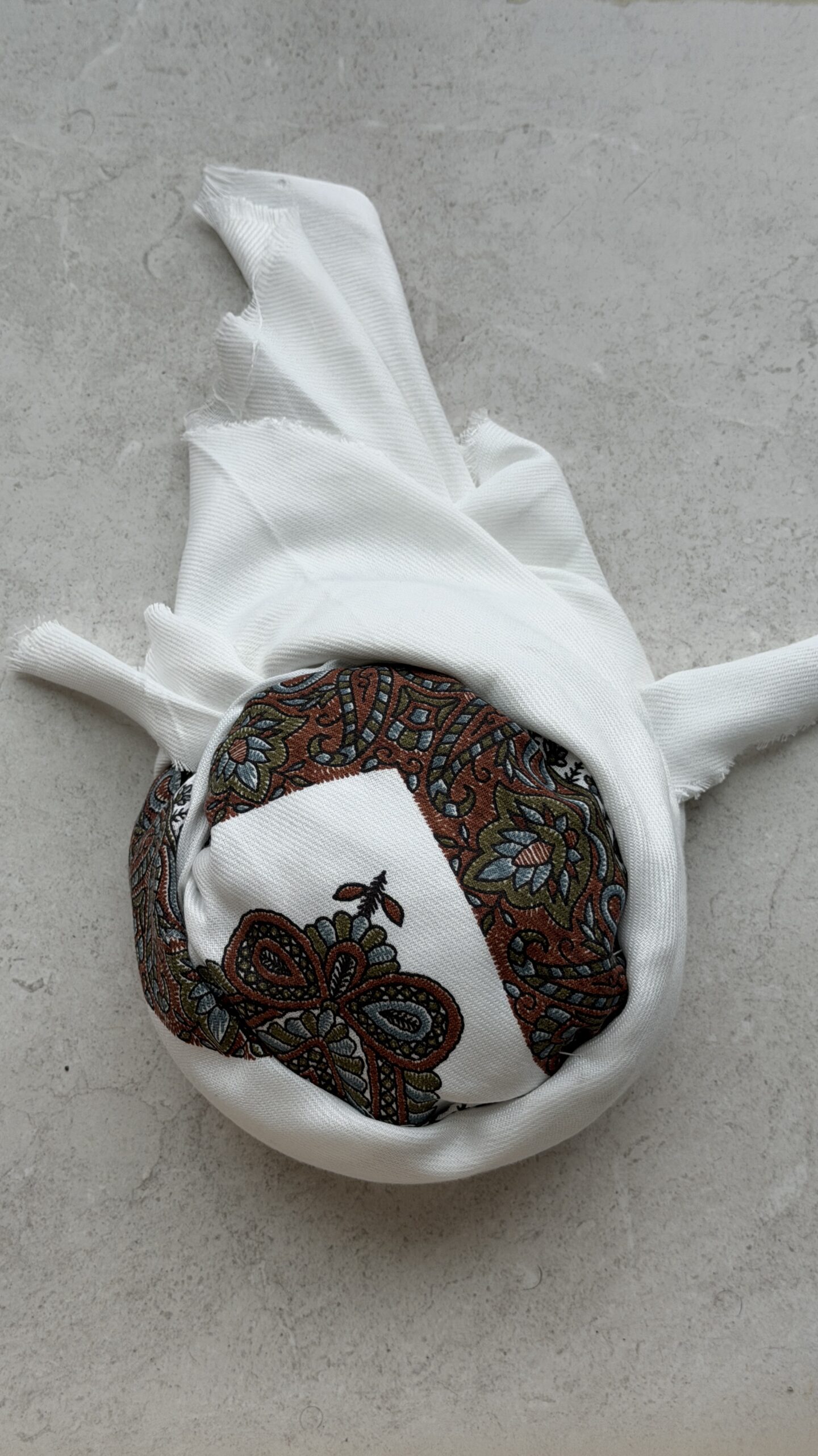 This a cashmere shawl print and in the Emirati style. To determine your child’s correct size, please measure their head circumference in inches. If measuring in centimeters, multiply that measurement by 2.54 to get the correct size in inches.